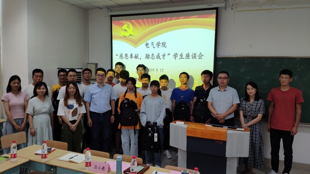 9月12日,中秋佳节来临之际,电气学院在电气楼301教室召开“感恩奉献,励志成才”学生座谈会。十余名家庭经济相对困难的2019级新生代表参加了座谈会,并收到了学院的爱心学习大礼包。电气学院党委书记吕小亮、副书记卿海龙出席本次座谈会,负责资助工作的辅导员及2019级新生辅导员、两名励志老生代表参加,座谈会由卿海龙主持。