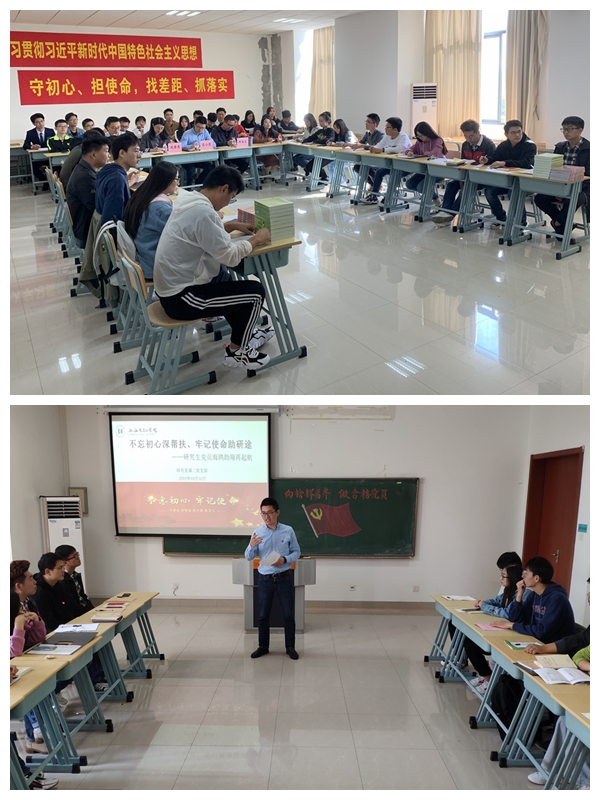 本次活动以四位党员同志朗诵的一首激情澎湃的诗歌《红船,从南湖起航》开场,带领大家共同回顾了我们党建党初期的开拓者们是如何践行不忘初心、牢记使命的;随后由研究生党员代表向全体党员发出了倡议:学习榜样,学习以黄文秀同志为代表的的一大批优秀共产党员的先进事迹,做好研究生党员的科研学术,帮扶身边学弟学妹的考研路,争做新时代有理想、有追求、有目标、有担当的优秀研究生;接下来由三位研究生党员从不同的角度向在场考研同学分享了考研经历,并把最真诚的祝愿送给考研同学,预祝他们能取得好的成绩;在结对赠书环节,18位研究生党员和18位本科生考研同学一一结对并赠送书籍,在接下来的一年里,他们将通过不间断的答疑解惑建立起研途友谊;考研学生代表在发言中表示研究生党员们提供的及时的帮扶对接下来复习有很好的指导作用,同时表达了对学院党委这种好的激励帮扶政策的感激之情,并表示接下来一定认真复习,争取考研成功!