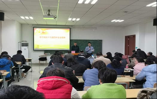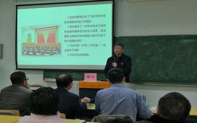 12月20日,电气学院在电气楼301召开全体教职员工会议,陈信书记作为学校十九大四中全会精神的宣讲团的一员专题做精神宣讲,学院党委书记吕小亮主持会议。