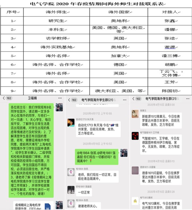 新冠肺炎疫情爆发以来,在学校新冠肺炎防控工作领导小组及国际合作与交流处的指导下,电气学院始终与海外访学师生、海外实践基地师生及海外名师保持联系,密切关注海外疫情发展,高度重视访学师生、海外实践基地师生及海外名师的健康与安全,多措并举,支援海外师生共同抗疫。