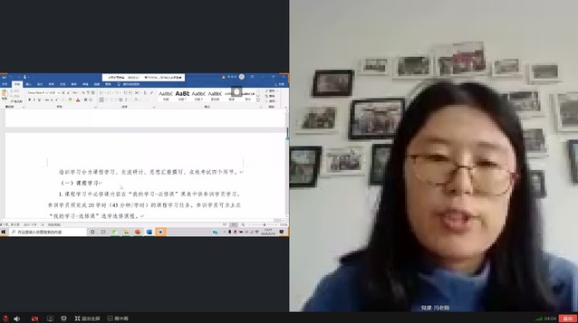 首先,学院组织员冯雯雯为各位学员详细介绍了本次入党积极分子线上培训班的主要目的,培训班的总体情况、小组划分情况及具体的培训计划和考核权重要求。除了本次线上培训要求的基本课时、主题研讨、小结撰写及在线考试外,本次培训还根据疫情防控与青年担当等特殊的主题以视频会议的方式开展小组讨论交流学习,同时穿插阅读一本红色书籍、看一个“四史”相关的纪录片、“云”参观一个红色景点等强化学员对党的正确认识。