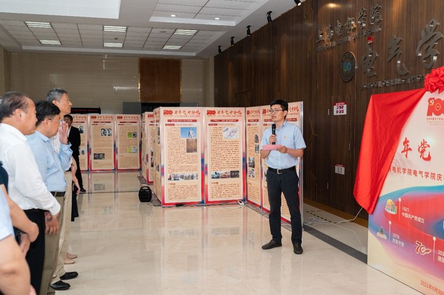 电气学院党委书记吕小亮代表师生党员简要介绍了本次展览的基本情况,他提到本次展览是今年4月1日在校党委书记鲁雄刚初次调研电气学院时共同策划推出的,借以展示、歌颂中国共产党成立百年来的革命精神和家国情怀。为使展览内容更加鲜活、更有朋辈教育意义,电气学院党委面向所有基层党支部和党员征集展览素材,学院师生党员踊跃投稿,共收到85名师生党员投稿,后经专家评审、选出49个具有代表性的素材进行展出,内容涵盖重大事件、重要人物、红色故事、重要战役、重要精神等,49块内容展板寓意中国共产党带领中国人民在1949年建立新中国;加上展览主题、前言和展望,总计52块展板取意“我爱”,寓意我爱中国共产党。整篇展览以师生党员作为党史讲述人的形式,以丰富的图片和真实的学习感受,让党史立起来、历史人物活起来,共同表达电气学院师生对党和人民的热爱之情,坚定永远跟党走的信心和决心。