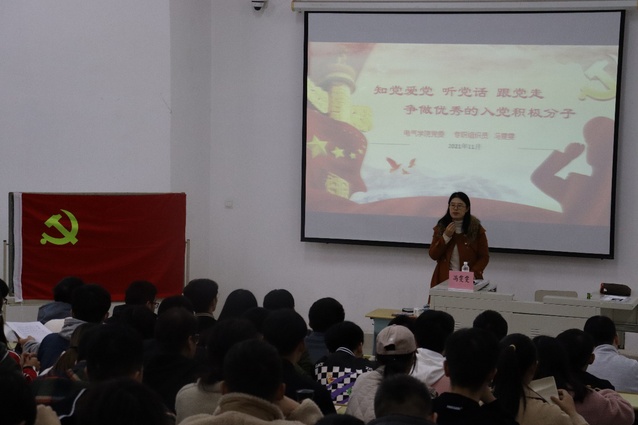 为了加强入党积极分子的培训工作,深化党的性质与指导思想,进一步提高入党积极分子的党的基础理论素养,11月26日下午1点,电气学院第40期入党积极分子培训班第四讲在D教105进行。本次党课由电气学院专职组织员冯雯雯老师主讲,课程主题为“知党爱党、听党话、跟党走,争做优秀的入党积极分子”。