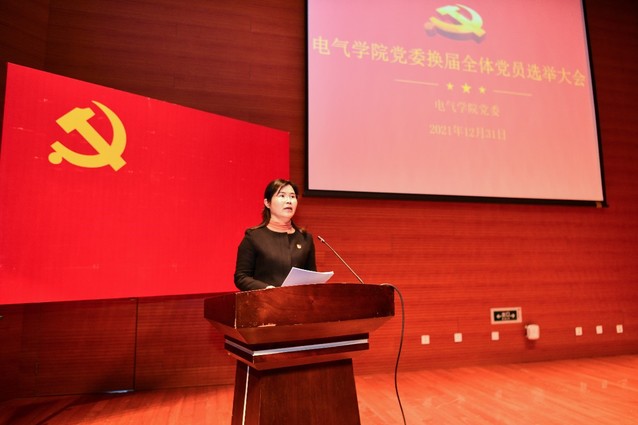 学校常委、党委组织部部长代表学校做最后的总结讲话。她首先对新当选的党委委员表示热烈的祝贺!她指出,电气学院党委的换届选举工作具有特殊重要的意义,2021年是建党100周年,马上进入的2022年是党的二十大即将召开的一年,是学校十四五规划的开局之年。换届选举作为党的政治生活中最基本、最基础的工作之一,电气学院党委的各项工作扎实规范,进展有序,充分发扬了党内民主,体现了公平、公正、公开的原则。同时代表学校党委提出了三点希望与要求:一是要坚持学习,积极建设学习型、服务型、创新型党组织。要以党的创新理论滋养初心、引领使命,推动习近平新时代中国特色社会主义思想往实里走、往心里走、往深里走,将学习贯穿始终,聚焦工作实际,做到理论联系实际。不断增强“四个意识”、坚定“四个自信”、做到“两个维护”。二是要坚持密切联系群众,切实发挥党组织的战斗堡垒作用。学校基层党组织是党密切联系广大师生员工的桥梁和纽带。广大师生是从基层组织的工作和周围党员的表现来认识我们党、评价我们党。在新的历史条件下,必须充分发挥党密切联系群众的优势,始终与人民心连心、同呼吸、共命运,不断加强党的自身建设,确保党的各项任务才能落到实处。三是坚持创先争优,无私奉献,做好学校发展的“排头兵”。党员是党的基层组织的细胞,是党的生命力与战斗力的基础,党组织的政治引领作用和战斗堡垒作用是通过每个党员的先锋表率作用体现出来的,学校马上跨入“十四五”建设的新征程,机遇和挑战并存,动力与压力同在。希望每个党员率先垂范、带动一片,团结一心、攻坚克难,为创造更加美好灿烂的明天不断奋斗!