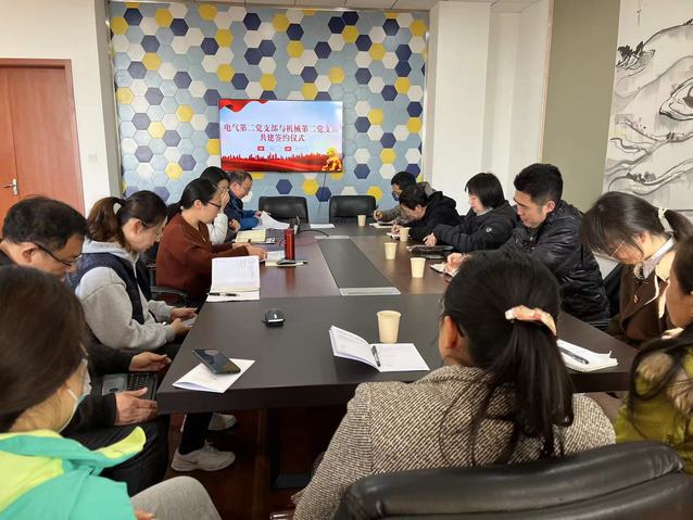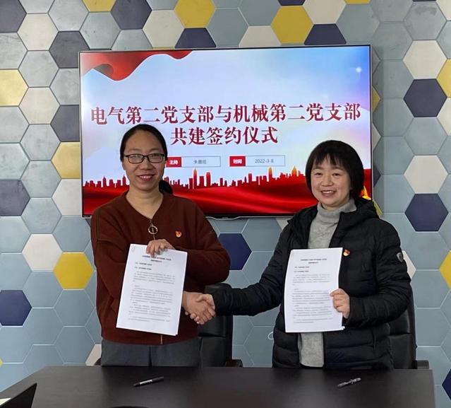 为加强基层党组织建设,进一步推进党建工作与业务工作的深度融合,发挥党组织的凝聚力和战斗力,形成互带互动、优势互补、共同发展的基层党建新格局。3月8日上午,正值三八妇女节,电气学院第二党支部书记朱晨烜与机械学院第二党支部书记孙群带领两个支部的教师党员齐聚电气楼401室,共谋党建促进党的教育事业发展之大计。会议由电气学院第二党支部书记朱晨烜主持,双方支部共16名同志参加了签约仪式。