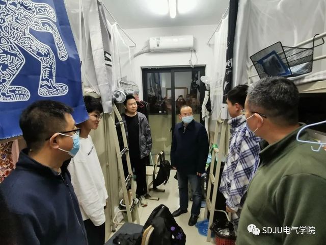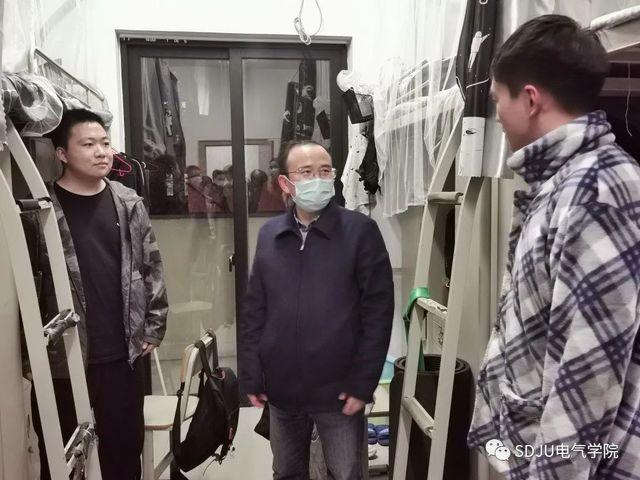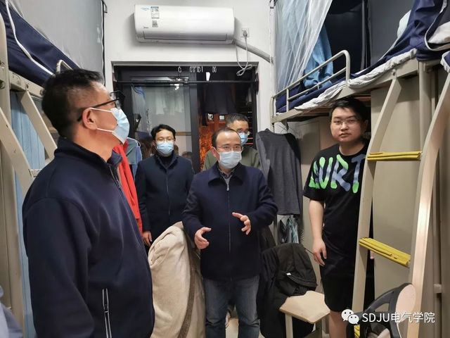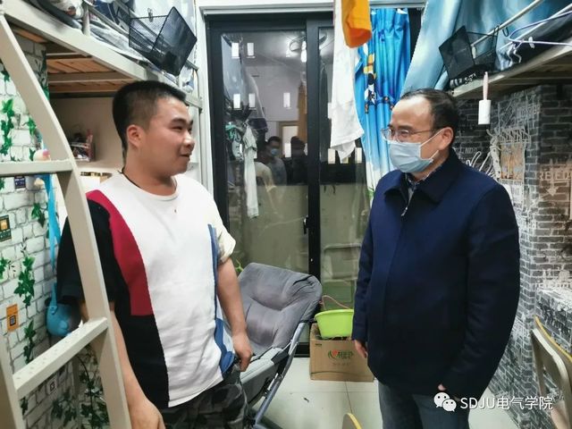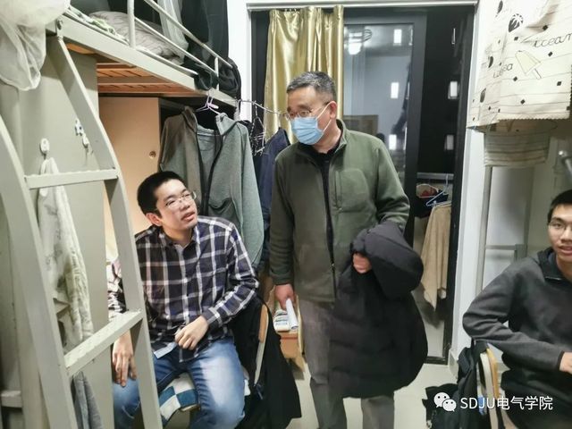 3月14日,受新冠疫情影响,学校进入闭环管理。电气学院院长陈国初,副书记副院长卿海龙、副院长李梦达及辅导员一行来到学生宿舍楼,看望在寝室进行网课学习的同学。
