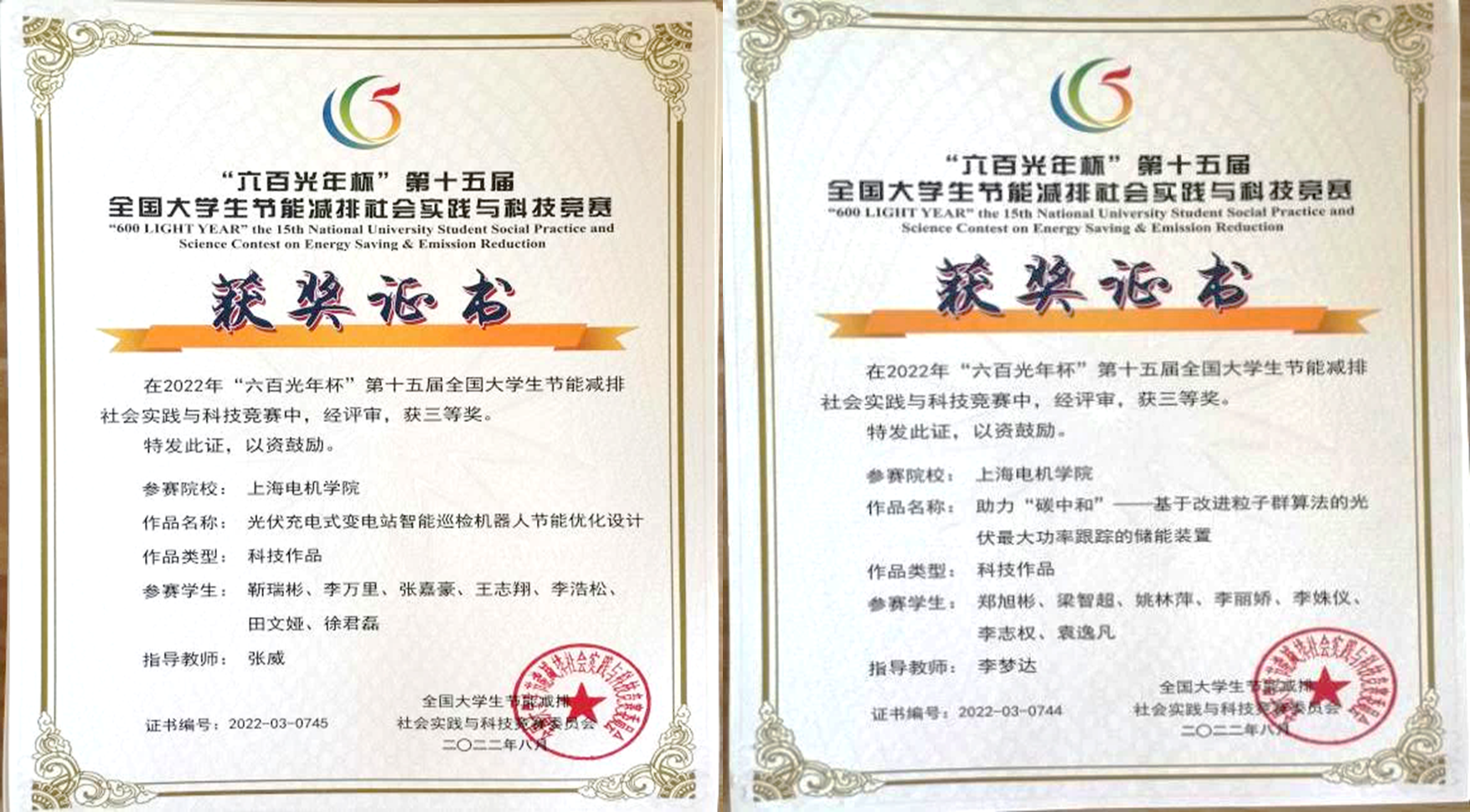 自赛事启动以来,我校积极组织学生参赛。电气学院于5月中旬聘请校外专家评审,最终推选出15部作品参加全国比赛。经过网上作品申报、作品初评、评审委员会专家评审等环节,最终由全国大学生节能减排社会实践与科技竞赛委员会评审表决通过,我校学生靳瑞彬、郑旭彬分别负责的《光伏充电式变电站智能巡检机器人节能优化设计》、《助力“碳中和”——基于改进粒子群算法的光伏最大功率跟踪的储能装置》两个作品荣获国家三等奖。