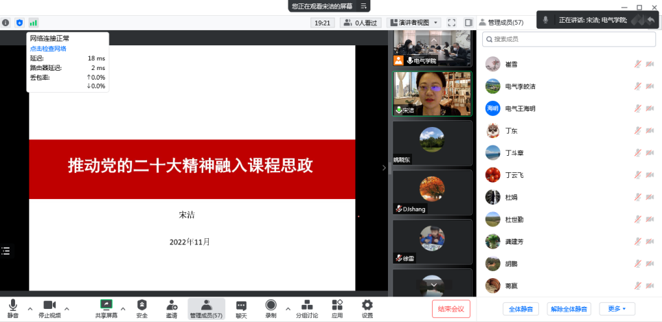 11月4日,电气学院通过线上线下结合的方式开展全体教职工政治理论学习活动,学院党委书记刘俊领学党的二十大报告精神,同时邀请马克思主义学院宋洁教授为全体教师作《推动党的二十大精神融入课程思政》专题辅导报告,以更好地推动党的二十大精神进教材、进课堂、进头脑。电气学院党政班子成员及全体教职工参加学习。