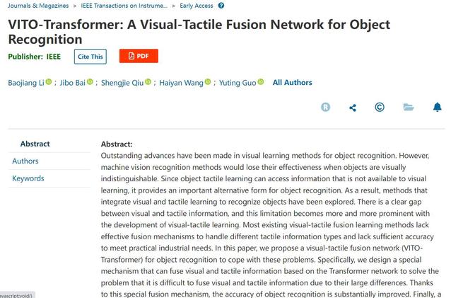 近日,我校电气学院智能决策与控制技术研究团队在测量领域顶级期刊IEEE Transactions on Instrumentation and Measurement(IF 5.6,中科院二区)上发表题为“VITO-Transformer: A Visual-Tactile Fusion Network for Object Recognition”的学术论文。该研究成果以欧冠官方网站入口为唯一单位,李保江老师为第一作者及通讯作者。