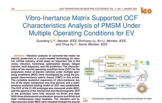 近日,我校李全峰老师与英国伦敦国王学院(King's College London)工程学院教授团队合作,李全峰老师作为第一作者,在国际知名期刊《IEEE TRANSACTIONS ON INDUSTRIAL ELECTRONICS》(IEEE工业电子汇刊)上发表了题为“Vibro-Inertance Matrix Supported OCF Characteristics Analysis of PMSM under Multiple Operating Conditions for EV”(基于振动惯性矩阵的电动汽车永磁同步电机多工况OCF特性分析)的学术论文。