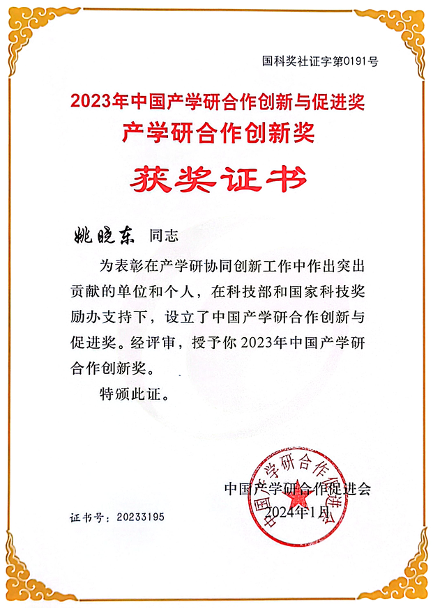“中国产学研合作创新与促进奖”是由中国产学研合作促进会设立的产学研界最高荣誉奖项,对于弘扬创新精神、科学精神、工匠精神,推动产学研深度融合和经济高质量发展具有重要的激励作用。