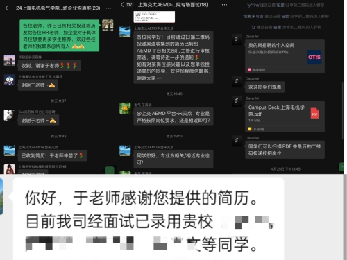 招聘会上,上海交大AEMD平台、奥的斯电梯管理(上海)有限公司、上海华建电力设备股份有限公司、上海同盛电力有限公司、凯思勒传动技术(上海)有限公司、上海太易检测技术有限公司、上海北羽自动化科技有限公司、富奥汽车零部件股份有限公司、特来电新能源股份有限公司、上海贺通人力资源管理(集团)有限公司、上海新华控制技术集团科技有限公司、上海纽特科机械科技有限公司、上海中车艾森迪海洋装备有限公司、上海康达电力安装工程有限公司等通过PPT宣讲、播放宣传片等方式向同学们介绍了企业概念,招聘岗位职责要求、工作地点、薪资及福利待遇等。为便于企业与学生更好地交流,电气学院为每家参加宣讲企业专门建立了微信面试群。