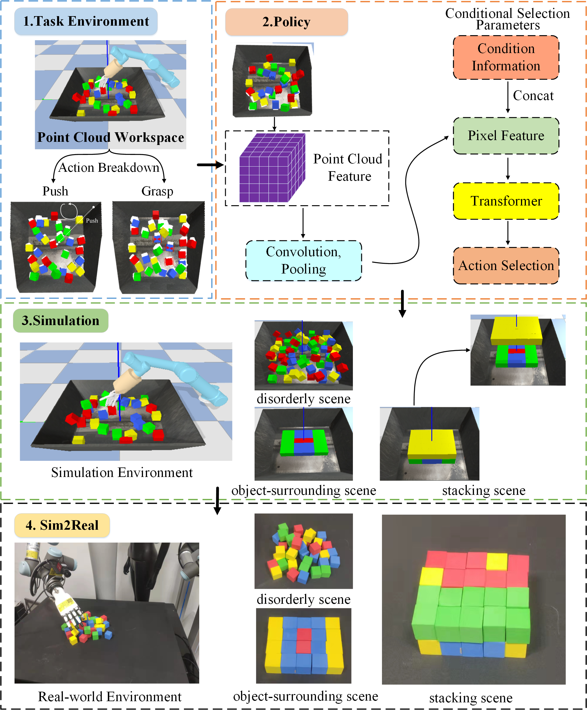 在与外部环境交互时,机器人面临着各种挑战,包括在杂乱环境中受到干扰以及难以准确定位目标物体。然而,面对复杂的非结构化环境时,人手往往能从容应对:推动能重新排列杂乱物品的物体、定位目标物体并为手指创造空间;抓取动作可以实现不相关物体的精确移动,与推动动作相辅相成。受此启发,为了使灵巧手能够在复杂环境中执行精确的抓取任务,智能决策与控制技术研究团队为机器人灵巧手提出了一种新的数据驱动抓取方法:推抓策略。该方法将人类抓取与无模型深度强化学习相结合,实现了机器人的协作抓取能力。该方法首先训练一个端到端的条件转换器抓取网络,该网络将视觉点云输入转化为动作输出。使用DQN算法进行策略训练,并通过微调方法进一步增强实际学习效果。实验结果表明,推动-抓取策略显著提高了抓取性能,协作抓取的成功率提高了8%。值得注意的是,这种微调方法大大减少了实际训练时间,真实环境的训练时间只占模拟环境的五分之一。即使在以混乱和复杂为特点的苛刻场景中,该方法也能促进快速学习。这项研究为有效解决涉及多指灵巧手和人机交互的复杂挑战提供了新的见解,对具身智能研究具有借鉴意义。