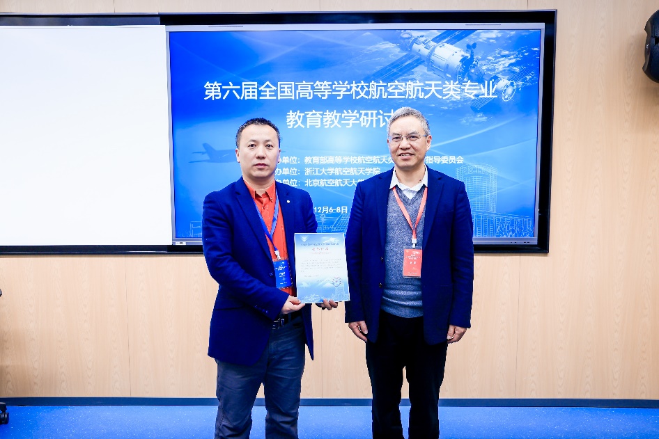 研讨会共邀请6位航空航天重点高校的院长作主会场报告,共同探讨航空航天类人才培养与实践方法,同时围绕 “航空航天类专业课程思政与教材建设”、“航空航天类一流专业和一流课程建设”、“航空航天新工科教学改革与实践”、“航空航天创新拔尖人才培养模式改革与实践”主题开设四个分会场。电气学院辅导员王海明作为教师代表参加研讨会,并在会上做了题为《航空航天类大学生创新创业能力内涵要素研究》的大会报告,教育部高等学校航空航天类专业教学指导委员会委员、中山大学刘昆教授为王海明颁授荣誉证书。