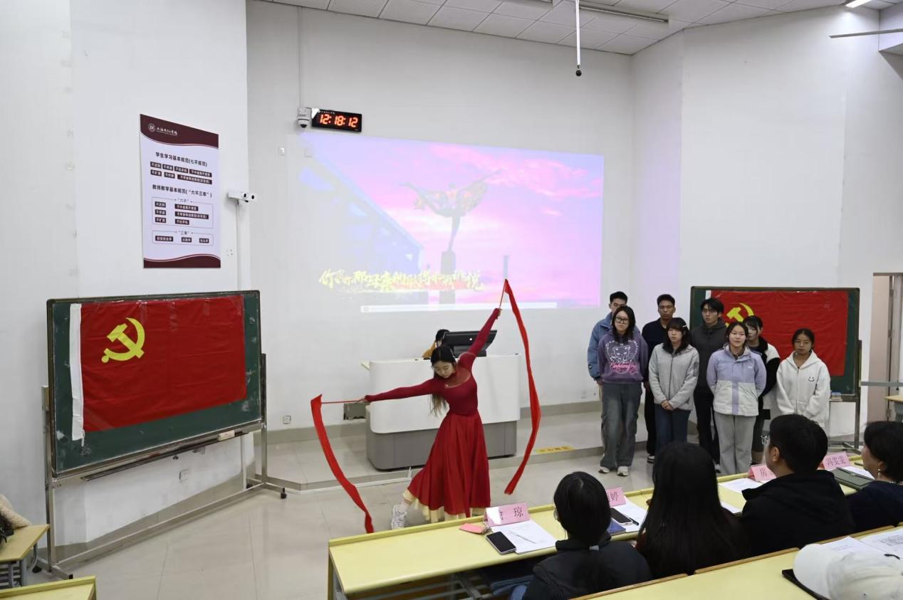 紧接着,本科生第三小组的表演闪亮登场。伴随着熟悉的前奏响起,小组成员们面带笑容、精神抖擞地站定,一首《我和我的祖国》缓缓唱响。清澈而真挚的歌声瞬间感染了全场,不少观众都跟着旋律轻轻哼唱。尤为吸睛的是,队伍前方一位身着鲜艳红裙子的女生,手中挥舞着飘逸的红丝带,伴着悠扬的歌声翩翩起舞。她的舞姿轻盈灵动,红丝带在半空划出优美的弧线,时而如火焰般热烈舒展,时而如波浪般轻柔起伏,与歌曲中对祖国的深情赞颂完美契合。成员们的歌声愈发嘹亮,从最初的轻柔诉说逐渐转为激昂高歌,红裙女生的舞蹈也随之变得更加奔放有力,将对祖国的热爱与身为入党积极分子的自豪,都融入到每一个动作与每一句旋律中。当最后一个音符落下,全场掌声雷动,不少人眼中都泛起了感动的泪光,现场洋溢着浓厚的爱国情怀与集体荣誉感。