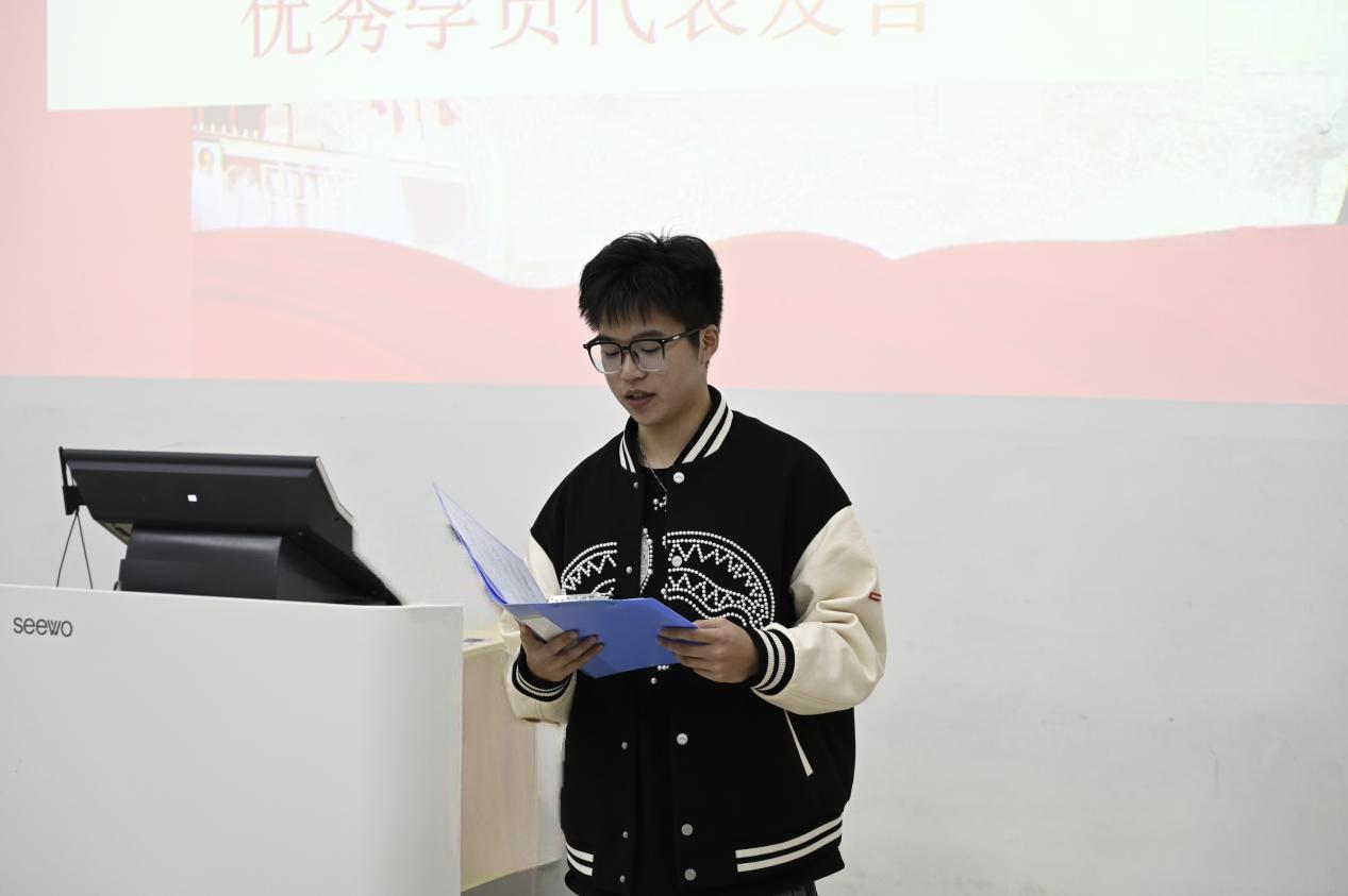 优秀学员代表、新能源2411班唐开新随后登台发言,他眼神明亮而真诚。他首先回顾了自己参训的初心:“成为入党积极分子的那一刻起,我就暗下决心,要抓住每一次学习机会,补足理论短板、锤炼党性修养。”接着,他分享了自己在培训中的收获与成长,他深情地讲到,这是培训通过对党的基本理论学习筑牢了信仰的根基;各项红色实践活动是深刻的红色洗礼,给予了充足的精神养分,在小组讨论中畅所欲言,既有理性的剖析,也有真诚的自我反思,思想的火花在碰撞中闪耀。在那些走出课堂的生动志愿服务活动中体悟奉献的快乐与价值,在红色教育基地参观中,一张张图片、一件件实物,无声地诉说着“祖国需要就是最高命令”的火热年代,更是触摸到了红色的精神脊梁。这些沉浸式的体验,让教科书上的文字变成了可感可知的精神血脉,让理想信念变得无比具体而鲜活。最后,他代表全体优秀学员作出承诺:“结业不是学习的终点,而是新的起点。我们将以此次培训为契机,继续深耕理论学习、积极投身实践,始终以党员标准严格要求自己,用青春和汗水为学院发展、为国家建设添砖加瓦!”
